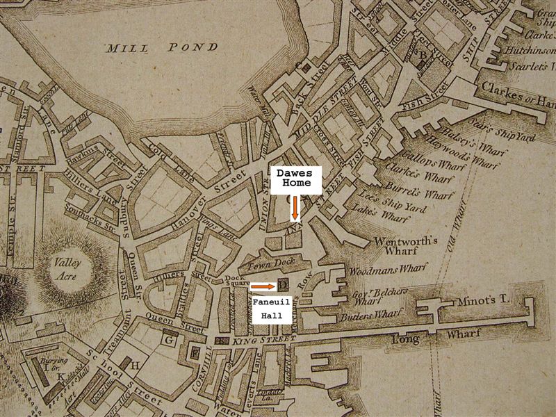 It had grown from just 150 or so souls in 1638 to around 15,000 in 1765, though many families had already evacuated to the countryside before 1775, fearing the outbreak of hostilities. The William Dawes family was living in the center of town at 64 Ann St., nearly across the street from that of William's father.