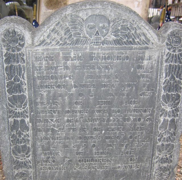 Why is it that neither William Sr. nor William Jr. were buried in the tomb established by Thomas3 Dawes in the center of the Burying Ground? One possibility: by the time of their respective deaths, 1802 and 1799, the tomb may have been full. The more likely explanation is that ownership of that tomb would have passed to William Sr.'s older brother, Story4 Dawes (William Jr.'s uncle), and thus may have been available only to direct descendants of Story, not to either of the two Williams4 or 5. Now, on to the final part of the puzzle: If this third gravesite is where William Sr., not his son, was buried in 1802, then where was William Who Rode laid to rest in 1799?