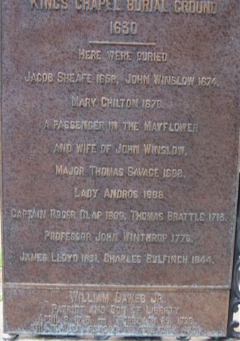 There is not just one Dawes tomb at King's Chapel: there are three! The oldest of them was established in 1820 by Thomas3 Dawes (1680-1749), third in the line of the American Dawes's and grandfather of William5 Jr. A stone marker at this tomb lists those buried: Thomas's parents, Ambros(e)2 and Mary; Ambrose's brother Jonathan2; Thomas3 and his wife Sarah, and seven of their children. This marker is located next to the simple tomb structure long thought to contain or mark the remains of William, Jr., and which bears the plaque that was placed in 1899.