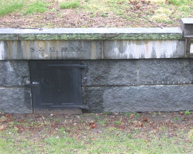In about 1836, the May family tomb was one of several moved to make way for construction of the Boylston Street Mall. They were relocated to another location in the Central Burying Ground, a sunken area called the "Dell". The May tomb, which had orginally been numbered 122, was assigned the new number of 131, and it bears the inscription "S. & E. May" — that is, Samuel and Ephraim May.