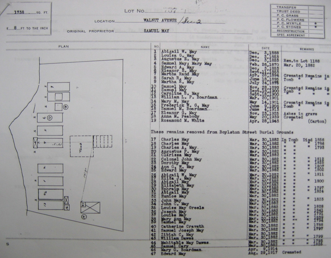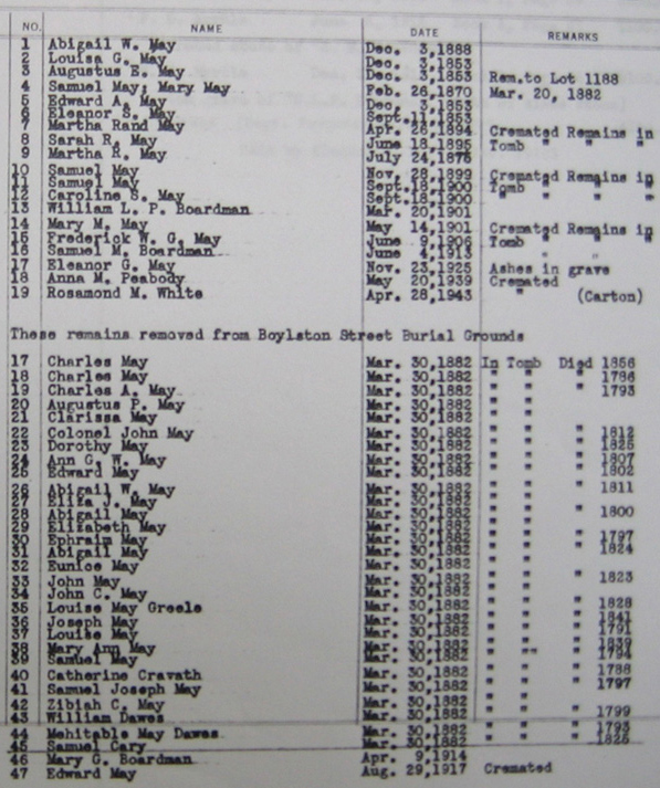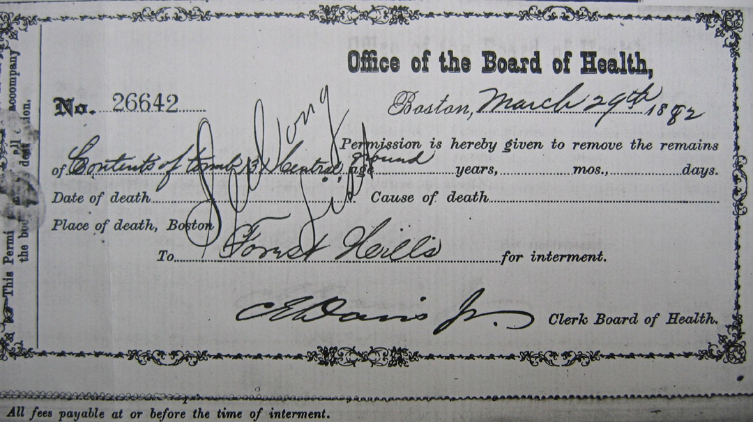 - Finally, Forest Hills files contain a certificate from the Boston Board of Health, dated March 29, 1882, reflecting the transfer of the May tomb from the Central Burying Ground to Forest Hills.