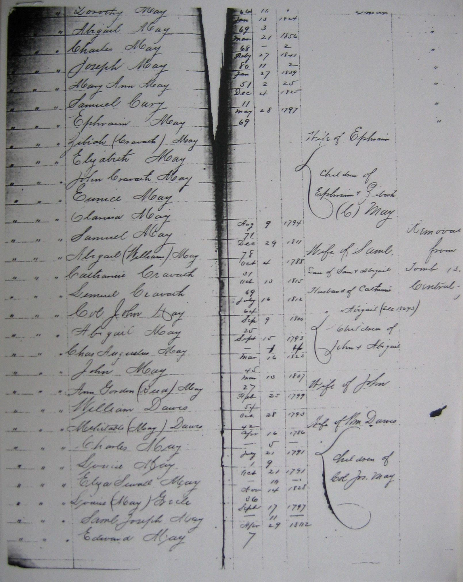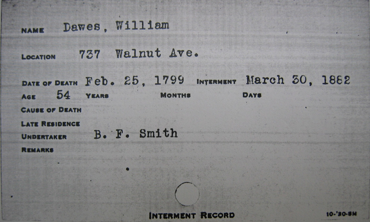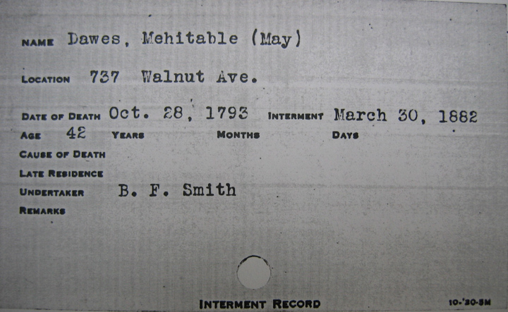 - The most dramatic document — one that "made his heart stop", according to Maze — is a handwritten ledger recording the ages, dates of death, and dates of interment in the May tomb. Here, well down a long list of Mays, is "William Dawes", aged 54, date of death February 25, 1799, and "Mehitable (May) Dawes", aged 42, "wife of Wm Dawes", date of death October 28, 1793. At the right-hand margin of the ledger is the following written comment: 'Removal from Tomb 131 Central B. G.'