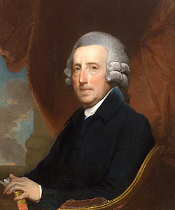 A second tomb is near the first and is marked by a tall obelisk erected in memory of Col. Thomas5 Dawes. This Thomas was another grandson of the Thomas3 who erected the first tomb, and was thus a cousin of William Jr. Known as "Boston's patriot architect," Thomas5 was a significant figure in Boston architectural and political history. He worked on remodeling of Faneuil Hall and the old State House, and on construction of the new State House and several buildings at Harvard University. He was active in the Revolution, and during their lifetimes, Cousin Thomas was better known in Massachusetts than William Jr. His portrait was painted by the famous American painter, Gilbert Stuart. Thomas died in 1809.