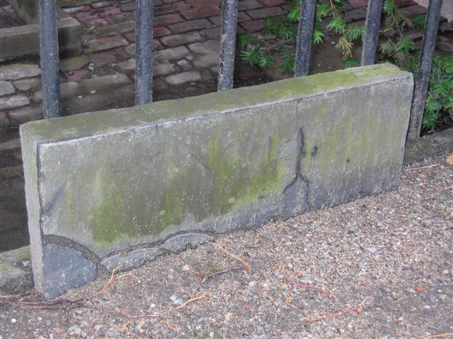 The third gravesite at King's Chapel is a new discovery by Charlie Bahne, and a real surprise! A line of 22 tombs lies along the eastern, or rear, edge of the burial ground. Several markers are missing, and most are at least partially buried. After consulting records old and recent, Charlie has found that grave number 14 belonged to William Dawes or "Daws". Today, only the top line of engraving on the stone — "No. 14" — is visible. Because evidence has now been found (see below) that William Jr is buried elsewhere, it seems certain that this marker refers not to William5 Who Rode, but to William4 Sr., his father. William Sr. died in November, 1802, over three and a half years after the death of William Jr.